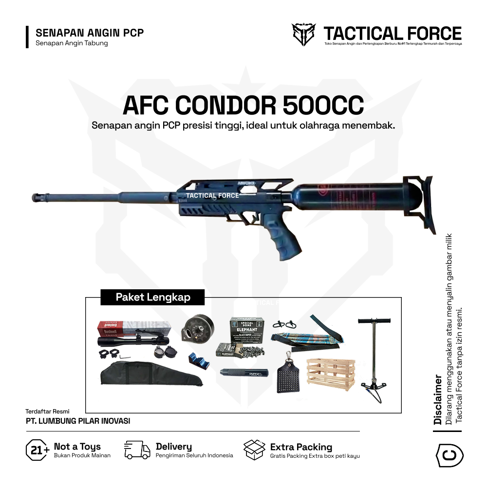 BOCAP Airforce Paket Lengkap hadir dengan tabung 500cc, chamber monolite, laras baja presisi, dan kelengkapan lengkap siap pakai. Ideal untuk profesional dan penghobi senapan angin.