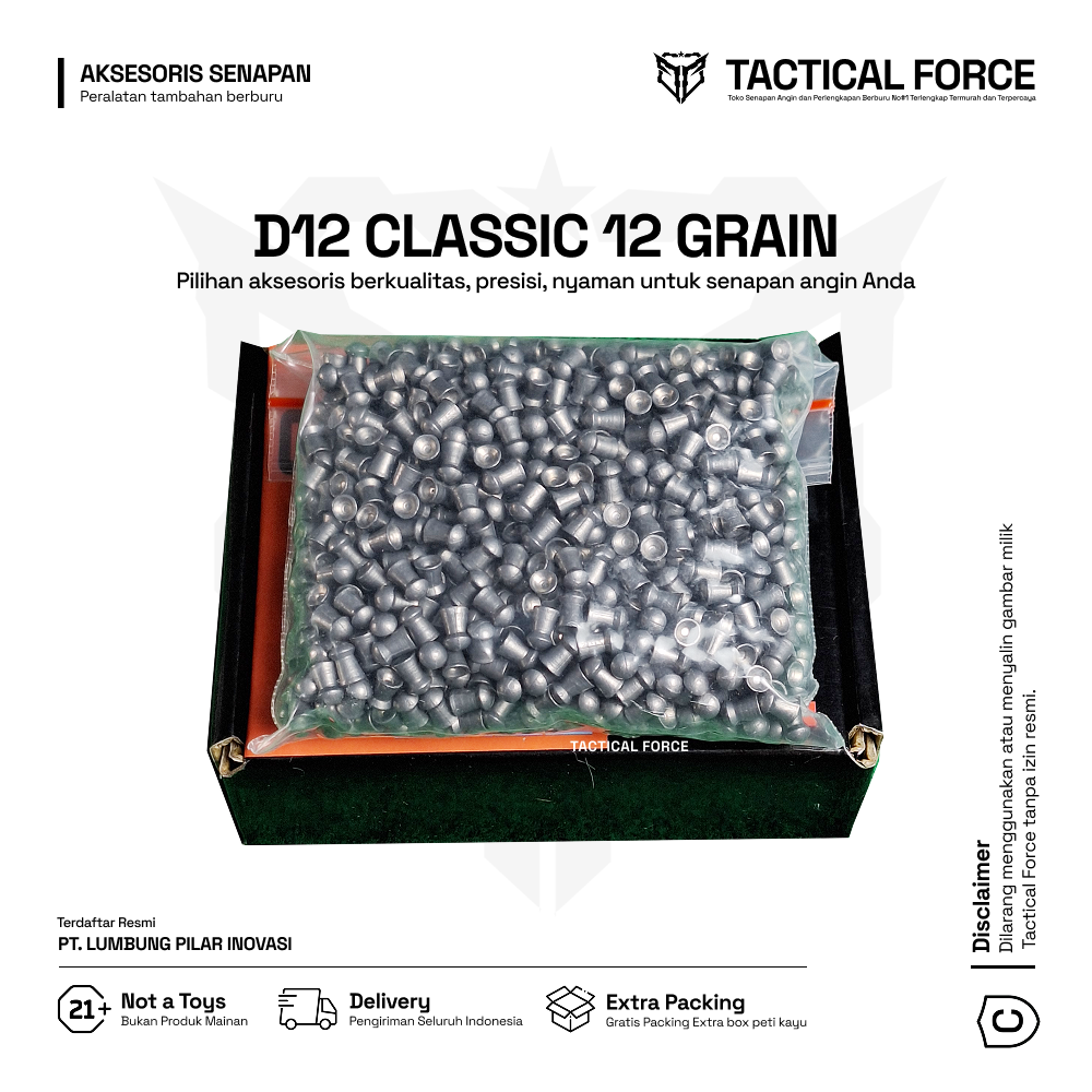 Mimis D12 Classic 12 gr adalah peluru mimis premium kaliber 4.5mm / .177 yang dirancang khusus untuk senapan angin jenis PCP maupun pompa manual dengan performa tinggi dan tingkat akurasi luar biasa. Mimis ini merupakan hasil riset panjang dari Tactical Force Indonesia yang selalu berfokus pada stabilitas lintasan peluru, keseimbangan berat, serta presisi pada jarak tembak menengah hingga jauh.