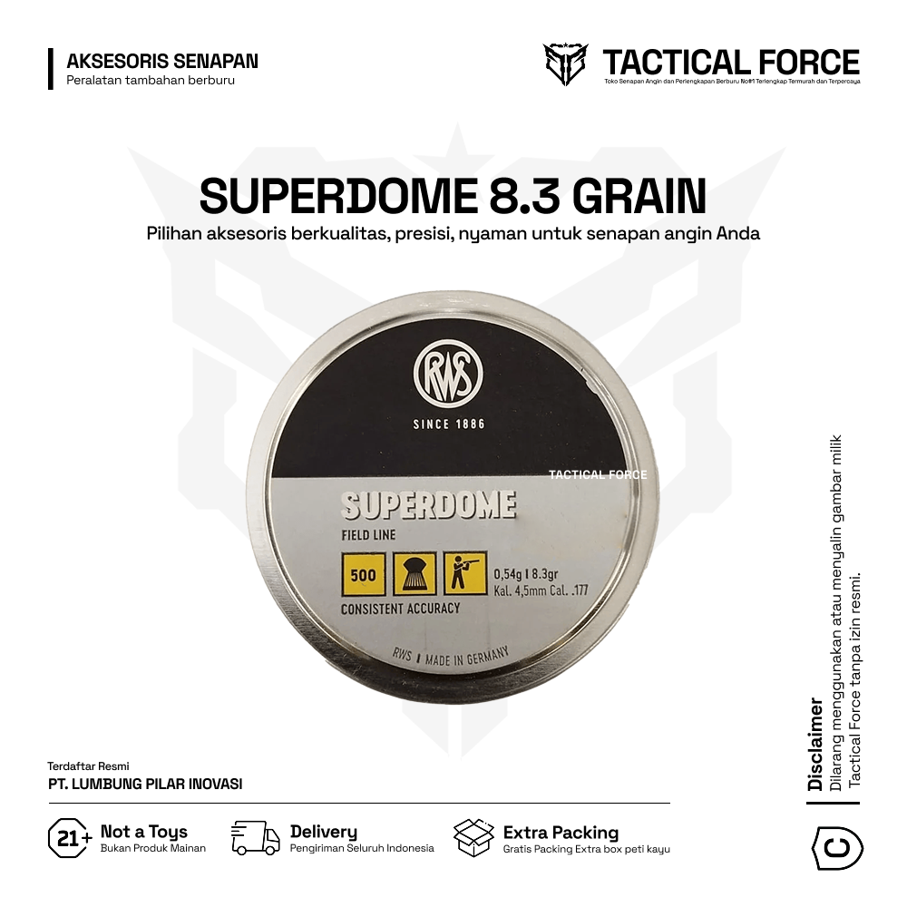Mimis Superdome 8.3 grain adalah pilihan terbaik bagi para penghobi senapan angin yang mengutamakan presisi tinggi dan stabilitas tembakan. Dengan desain berbentuk dome klasik dan bobot 8.3 grain, peluru ini diciptakan khusus untuk kaliber 4.5 mm / .177, sehingga kompatibel sempurna dengan seluruh unit senapan angin Tactical Force — baik tipe pompa manual (Sharp Series) maupun PCP bertekanan tinggi seperti Predator, Bocap, dan Mouser.
