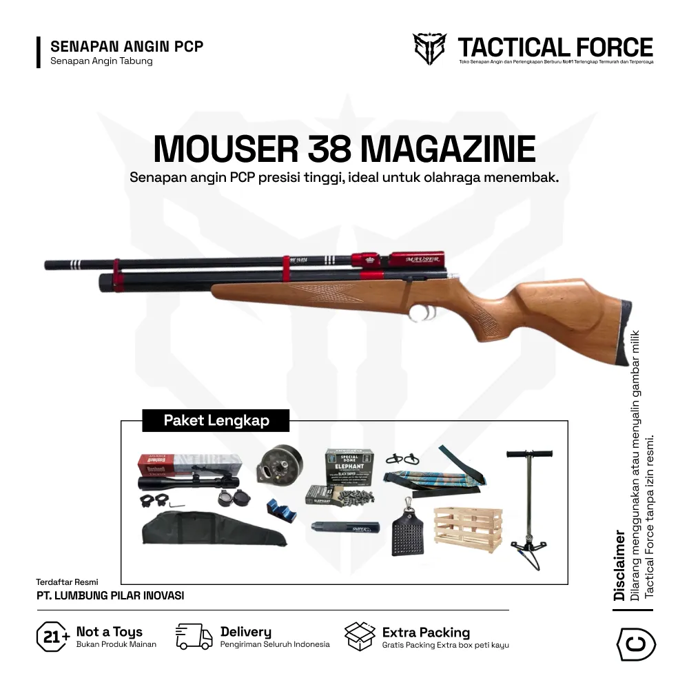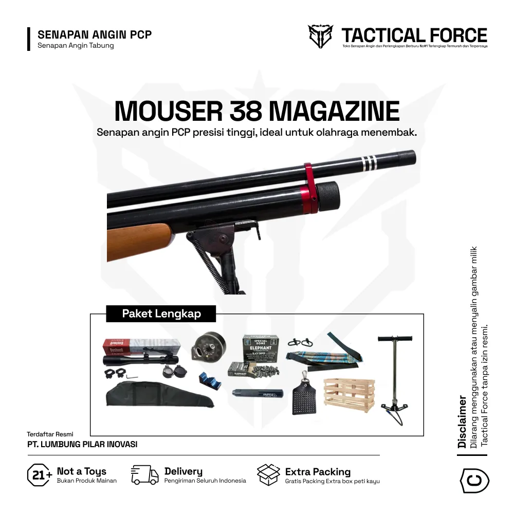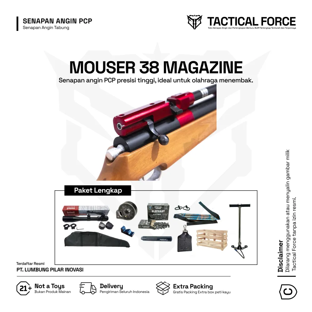 MOUSER 38 MAGAZIN adalah senapan PCP OD 38 berkekuatan tinggi dengan sistem magazin rotari dan power stabil hingga 3000 PSI. Varian paket lengkap sudah termasuk telescope, peredam, pompa PCP, dan tas premium—siap digunakan langsung dengan akurasi luar biasa hingga 100 meter