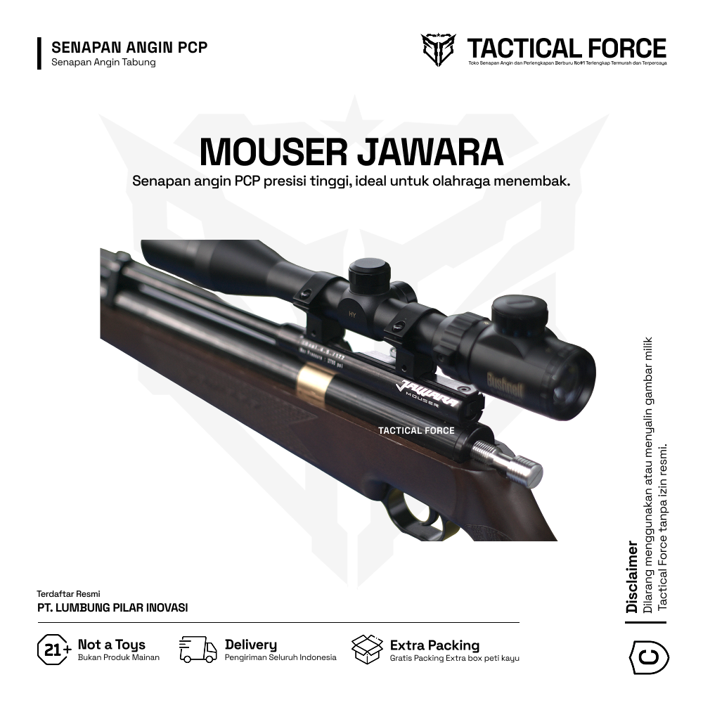 Mouser Jawara 32 Single adalah senapan PCP kaliber 4,5 mm dengan tabung stainless OD 32, laras baja 60 cm, dan mekanisme 2-speed untuk akurasi maksimal.