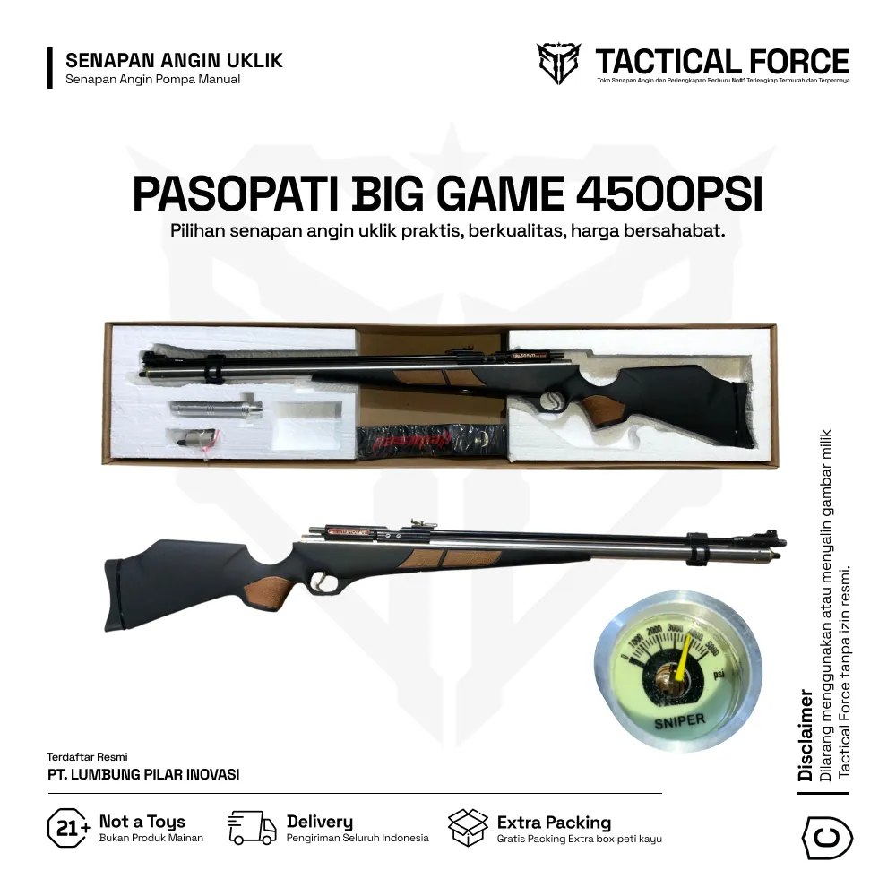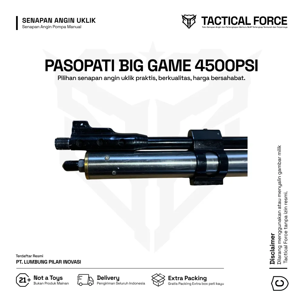 PASOPATI BIG GAME MONEL 27 adalah senapan angin premium dengan tabung Monel OD 27 bertekanan tinggi hingga 4500 PSI. Didesain kokoh, akurat, dan bertenaga, senapan ini ideal untuk pemburu profesional yang membutuhkan kecepatan tembak hingga 1300 FPS dan magazine 14 peluru.