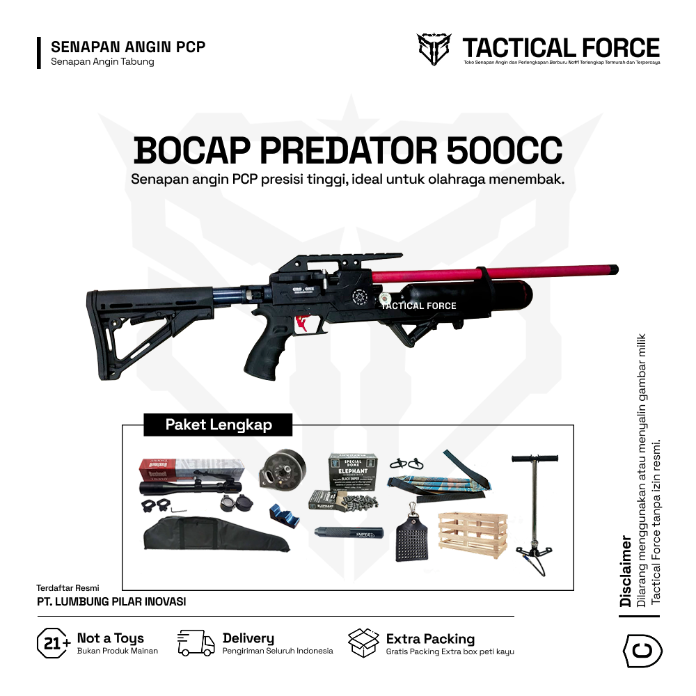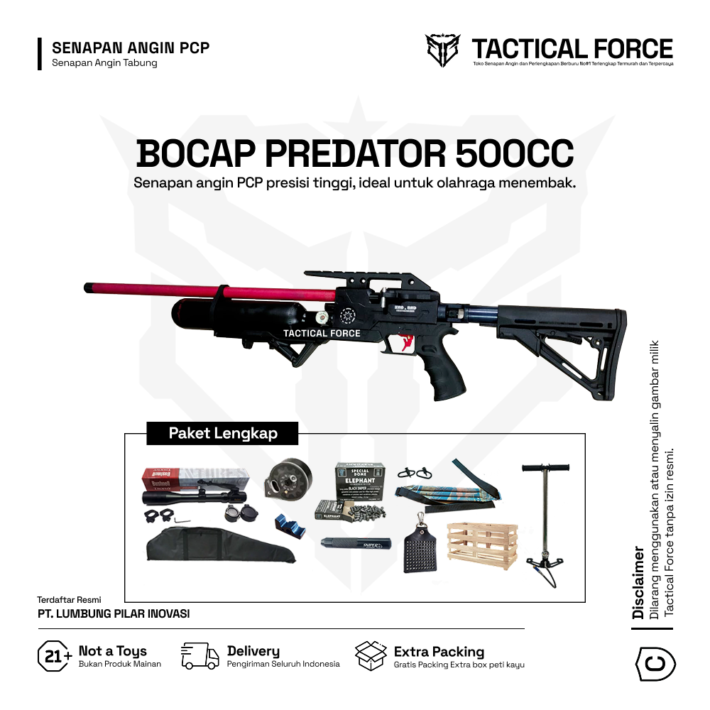 PCP Predator Bocap 500CC Paket Lengkap — senapan angin berkaliber 4.5mm dengan tabung besar 500cc, tekanan hingga 3000 PSI, akurasi tinggi, dan perlengkapan full set resmi Tactical Force Indonesia.