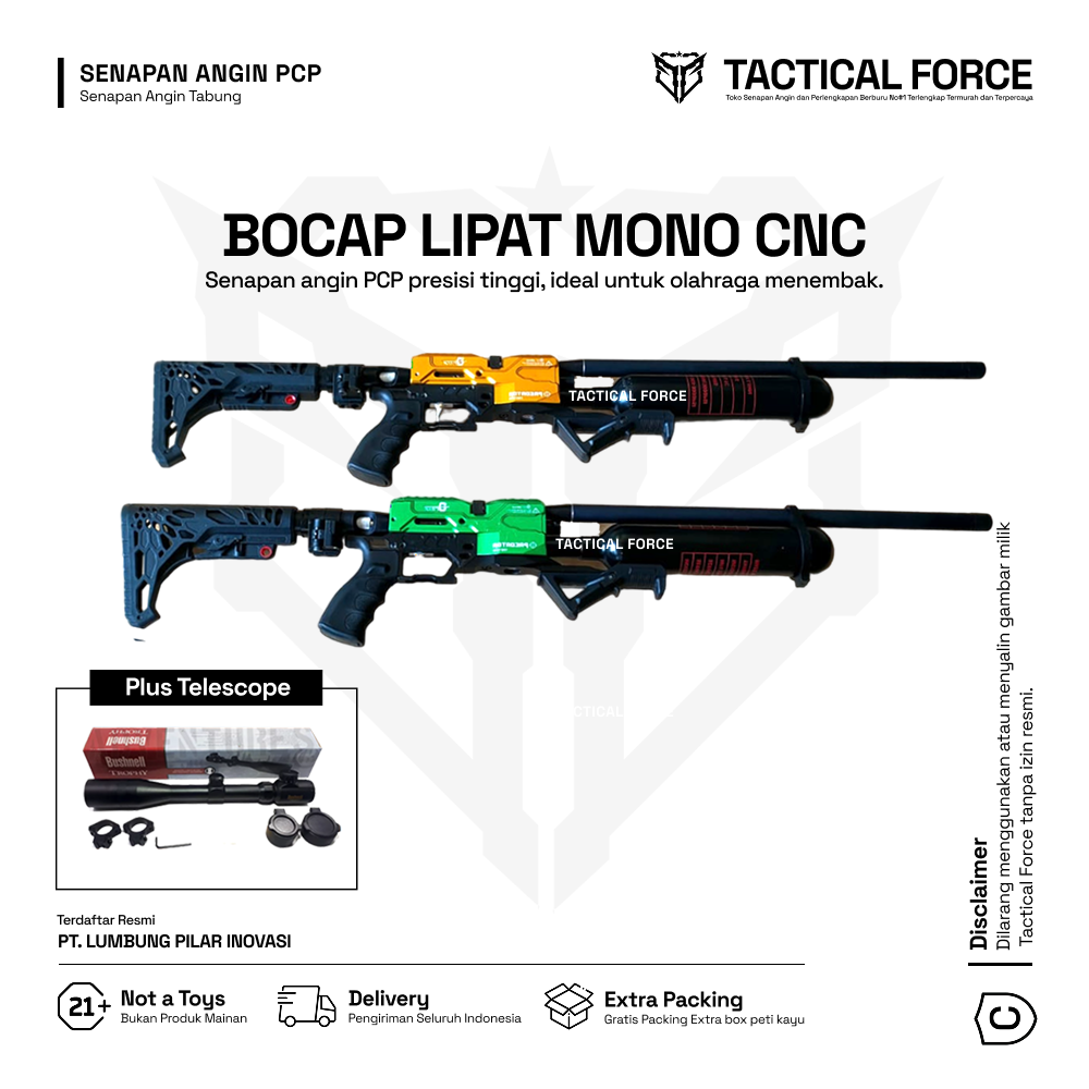Predator Bocap 500CC Popor Lipat Plus Telescope adalah salah satu senapan angin PCP paling dicari oleh para penembak olahraga dan kolektor di Indonesia. Dengan desain tangguh, performa stabil, dan kapasitas tabung besar 500cc buatan Taiwan, senapan ini menawarkan kombinasi ideal antara kekuatan, akurasi, serta kepraktisan lipatan popor untuk mobilitas tinggi.