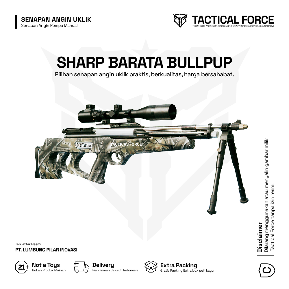 Sharp Barata Bullpup hadir sebagai jawaban bagi penggemar senapan angin yang mencari unit pompa tangan berkualitas dengan bodi bullpup yang ringkas dan ergonomis. Desain bullpup memendekkan panjang keseluruhan senapan tanpa mengorbankan panjang laras sehingga pengguna mendapatkan manuver lebih mudah, penyimpanan praktis, dan kenyamanan saat menembak di ruang terbatas seperti lapangan latihan sempit atau area rumah. Selain itu, Sharp Barata Bullpup dirancang untuk konsumen dewasa (21+), sesuai kebijakan penjualan Tactical Force.