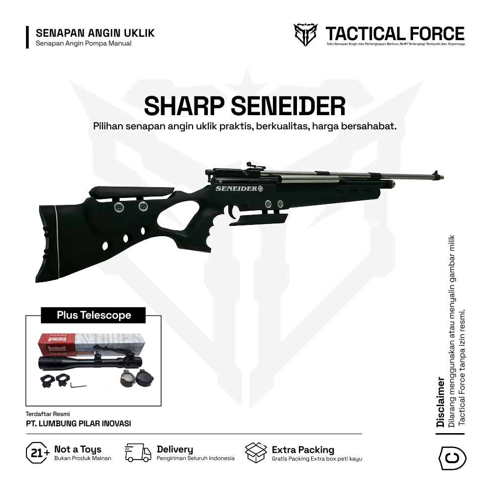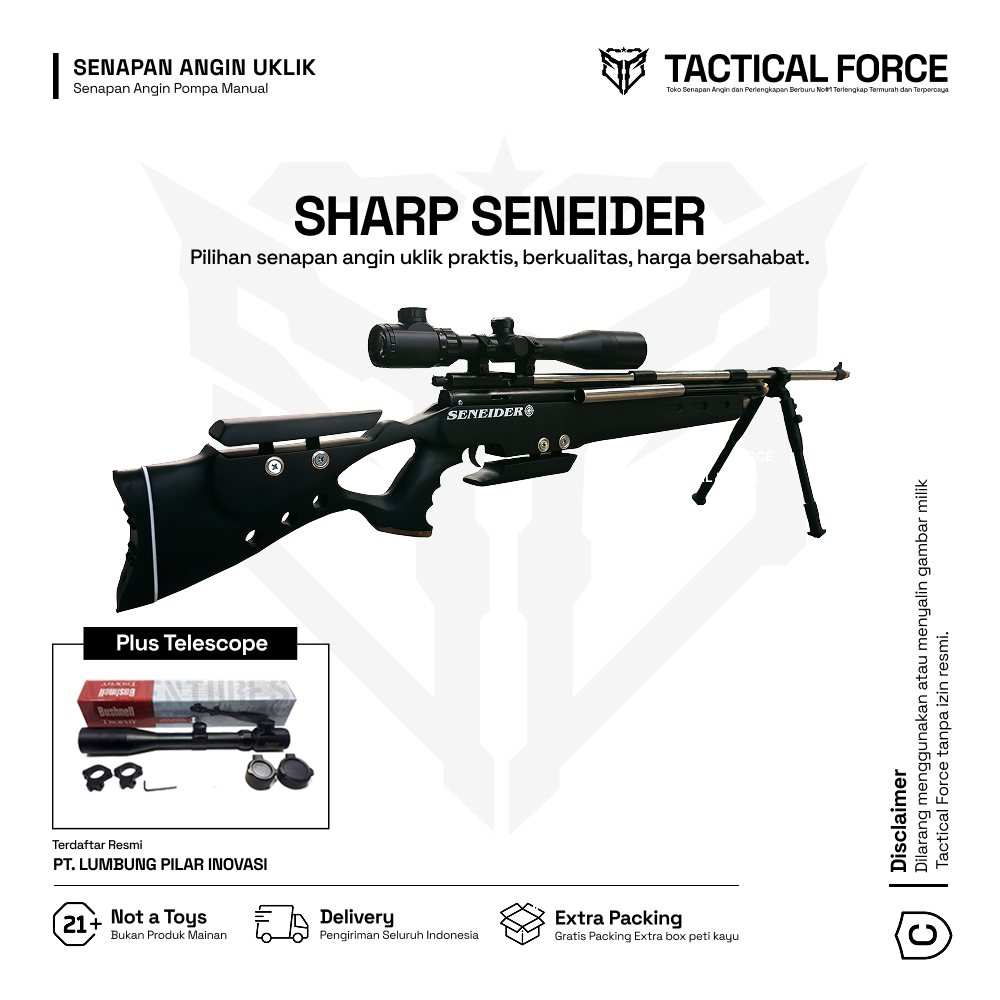 Uklik Seneider Pompa Samping Plus Telescope menghadirkan kekuatan, akurasi, dan tampilan elegan dalam satu paket lengkap. Dilengkapi Telescope 3-9x40EG Sunhide, laras baja 60 cm, serta sistem pompa samping ergonomis yang mudah dioperasikan. Produk resmi dari Tactical Force — legal, presisi, dan siap pakai untuk para penghobi menembak profesional.